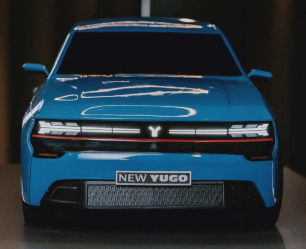 Mas mesmo com a má fama, há quem ainda goste do carrinho e deseja vê-lo de volta às ruas. E esse retorno pode ser elétrico. Os primeiros rumores sobre um possível novo Yugo surgiram em fevereiro deste ano, quando imagens teaser do modelo começaram a circular. Agora, meses depois, temos finalmente uma prévia oficial da nova versão, ainda que em forma de modelo em escala. Durante o Car Design Event 2025, realizado em Munique (ALE) no mês passado, a Yugo revelou seu primeiro conceito em miniatura.